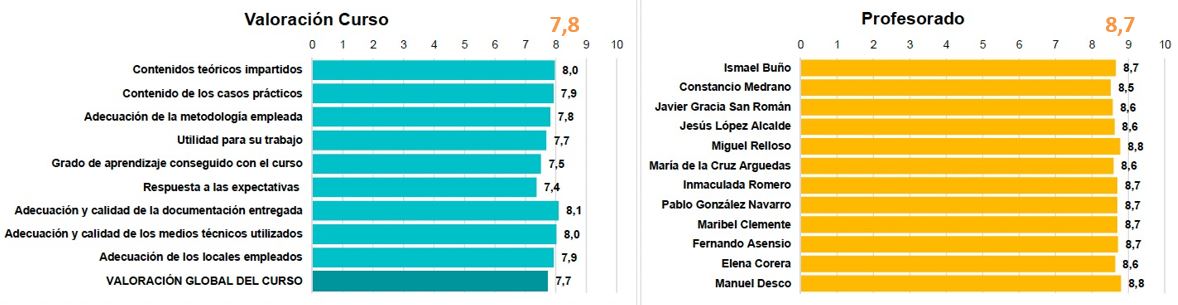 Asimismo, la valoración del profesorado del curso ha recibido una calificación excelente, con todos los profesionales implicados en la formación superando el notable alto como parte de la encuesta de balance sobre la actividad desarrollada.