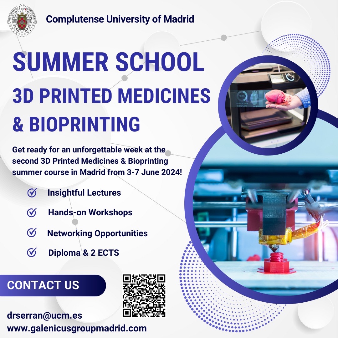 La Universidad Complutense de Madrid, organiza el Curso "3D Printed Medicines & Bioprinting" en Madrid del 3 al 7 de Junio.